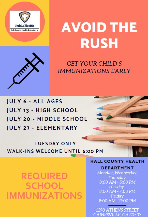 This is a reminder from the Hall County School District that students entering kindergarten, 7th, and 11th grade are required to receive certain immunizations. The Hall County Health Department is available to provide these immunizations on Tuesdays during the month of July, based on your child’s grade.