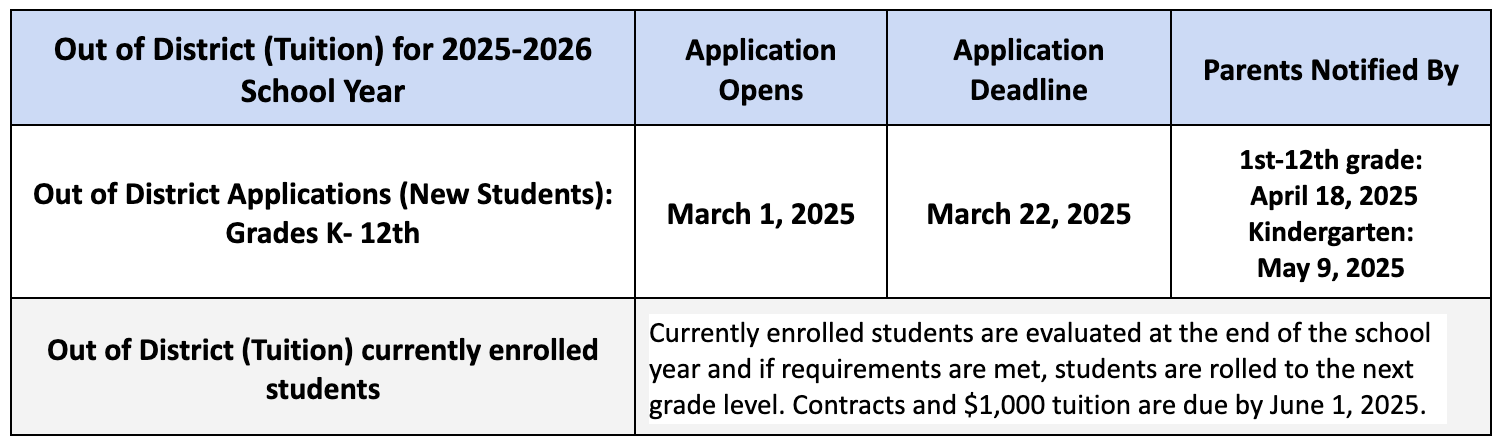 Out of District Applications for 2025-2026 School Year for First-Time Applicants for grades K-12th is Now Closed